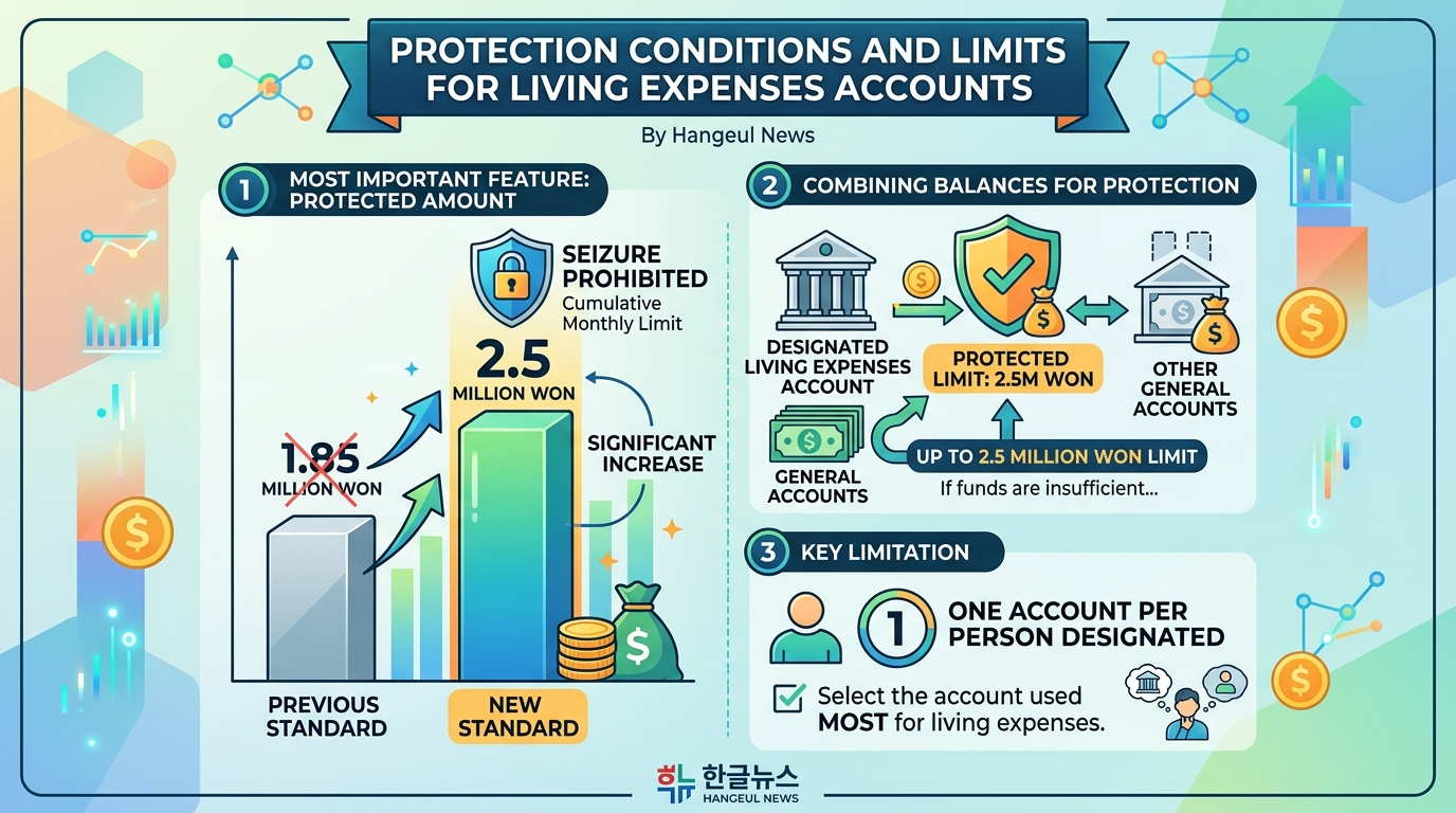 중요한 포인트는 이 계좌가 빚을 없애주는 해결책은 아니라는 점입니다. 대신 채권 추심이나 압류 상황이 발생하더라도 일정 금액만큼은 생계 목적 자금으로 남겨둘 수 있도록 하는 구조예요. 즉, 갑작스러운 압류로 생활비 전체가 묶이는 일을 줄이기 위한 제도라고 이해하시면 훨씬 쉬워요.