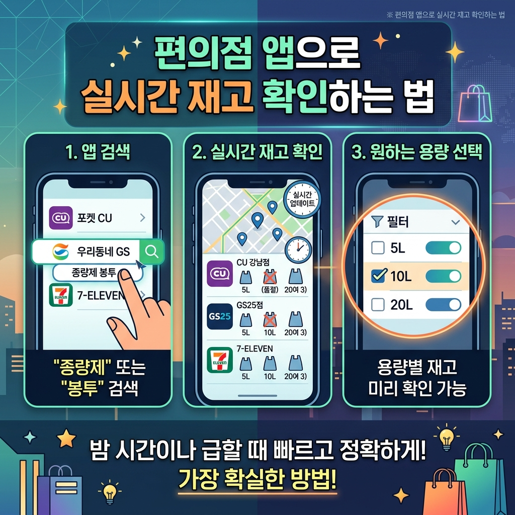 가장 먼저 확인할 곳은 편의점 자체 앱입니다. CU는 포켓CU, GS25는 우리동네GS, 세븐일레븐도 재고 확인 기능을 제공하는 경우가 많습니다. 검색창에 종량제, 봉투, 음식물봉투 같은 키워드를 입력하면 인근 점포별 판매 여부를 확인할 수 있습니다. 일부 매장은 5L, 10L, 20L처럼 용량별 재고까지 표시되기 때문에 헛걸음을 줄이는 데 도움이 됩니다. 다만 앱 화면에 재고가 있다고 떠도 실제로는 마지막 1~2개가 이미 판매됐거나 전산 반영이 늦는 경우가 있어서, 수량이 적게 보이면 방문 전에 전화로 한 번 더 확인하는 것이 안전합니다.