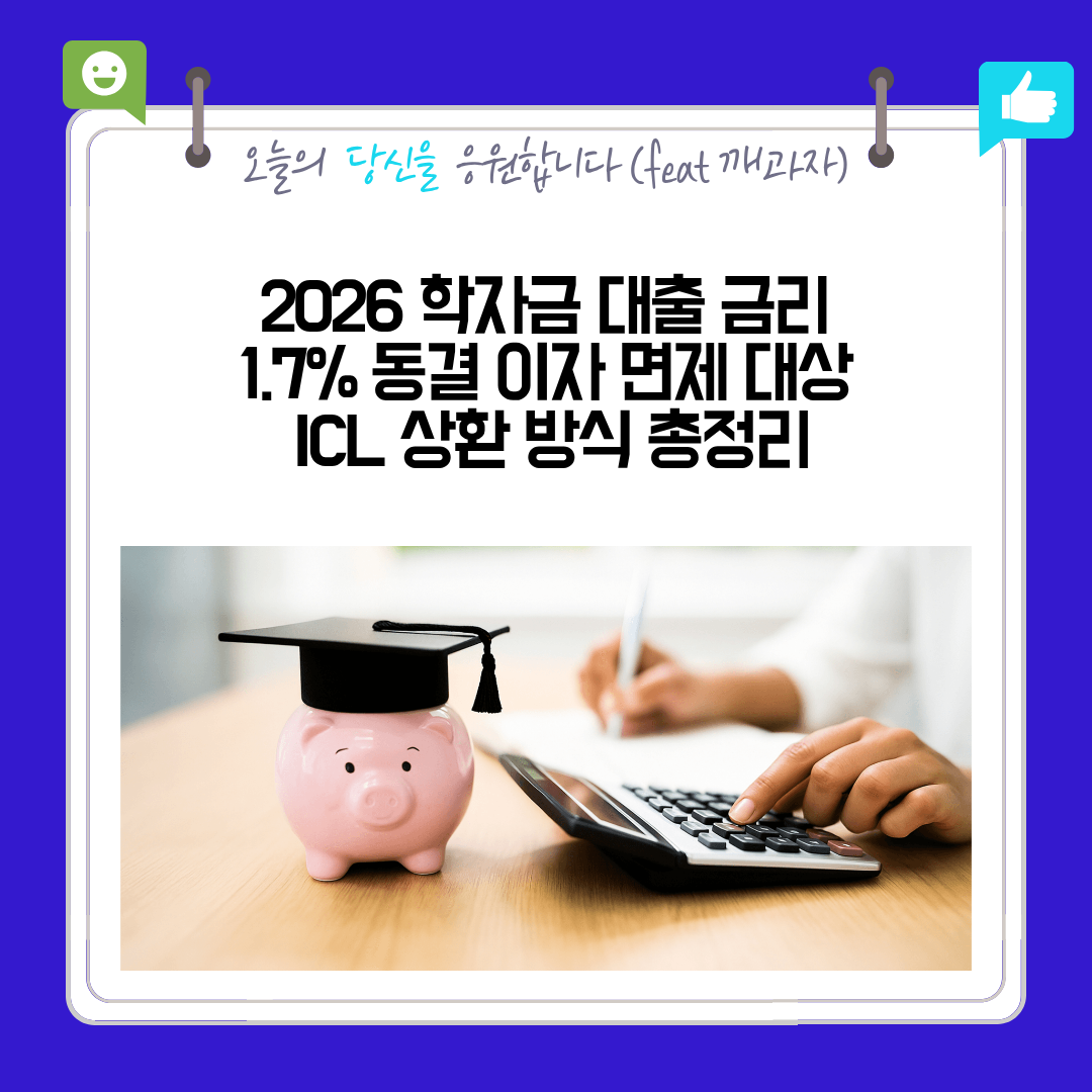 2026 학자금 대출 금리 1.7% 동결, 취업후상환(ICL) 이자 면제 확대, 등록금·생활비 대출 자격 차이와 실제 이자 계산까지 한 번에 정리했습니다.