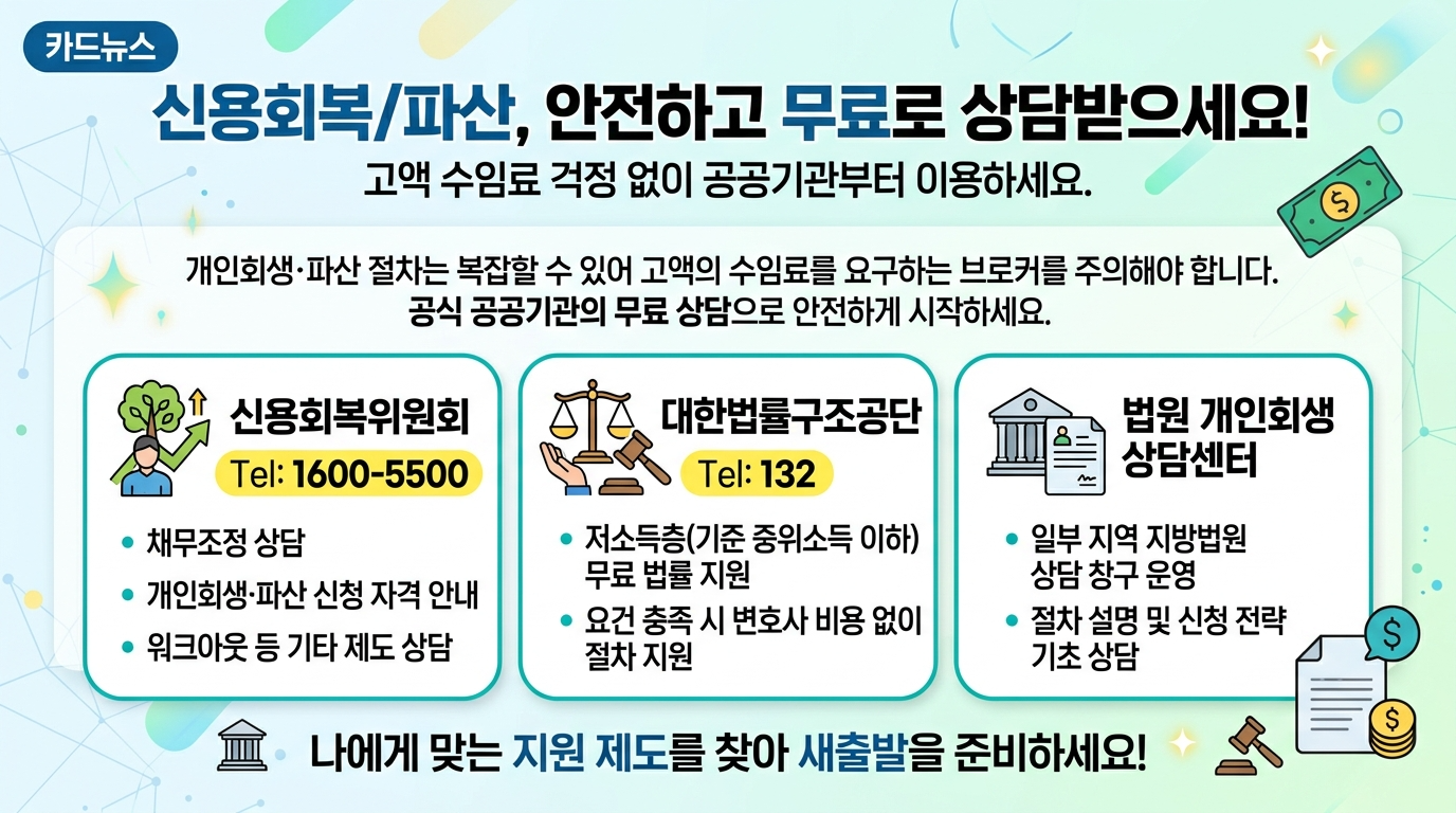 채무 문제는 혼자 검색만 하다 보면 더 겁이 날 수 있어요. 특히 브로커 광고나 과한 수임료 제안을 먼저 접하면 시작도 하기 전에 부담이 커질 수 있고요. 이럴 때는 공공기관 상담부터 먼저 받아보는 게 좋아요.