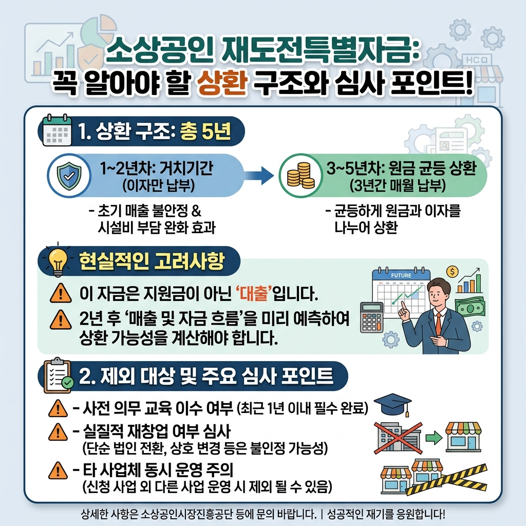 재도전특별자금의 전체 대출 기간은 총 5년입니다. 이 중 처음 2년은 거치기간으로, 원금은 갚지 않고 이자만 납부하는 방식입니다. 재창업 직후에는 매출이 안정되지 않거나 설비, 임차료, 재료비 등 초기 운영비 지출이 많은 경우가 많기 때문에 이 구조는 상당히 현실적인 장점이 됩니다. 이후 거치기간이 끝나면 남은 3년 동안 원금을 균등분할상환하게 됩니다. 즉, 지원금처럼 받기만 하고 끝나는 자금이 아니라, 일정 시점부터는 매월 원금 상환 부담이 발생합니다. 따라서 신청 전에는 현재 필요 자금만 볼 것이 아니라, 2년 뒤 예상 매출과 현금 흐름까지 고려해 상환 가능성을 미리 계산해보는 접근이 중요합니다.