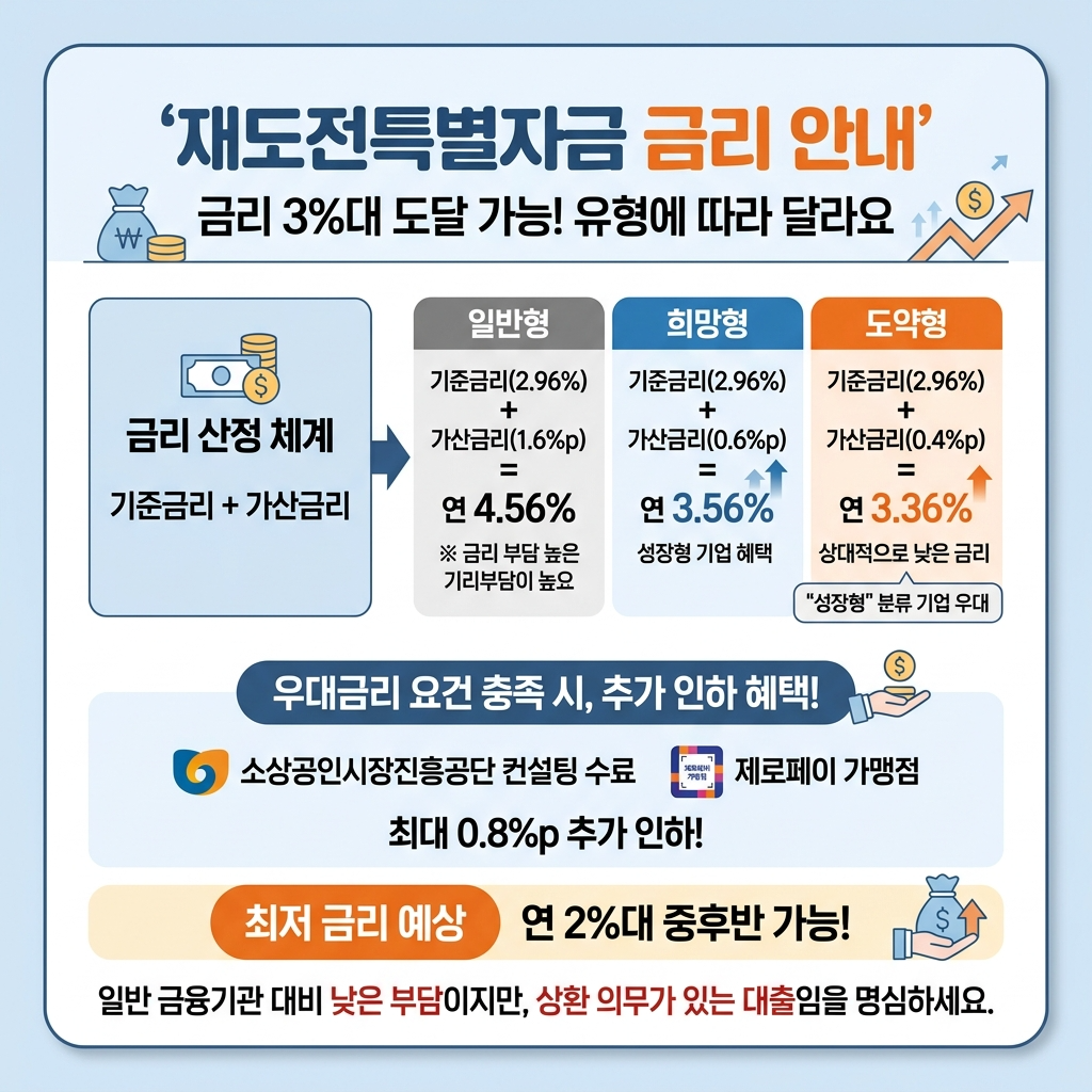 재도전특별자금 금리는 기준금리에 가산금리를 더하는 방식으로 결정됩니다. 제시된 기준으로 보면 기준금리가 2.96%일 때 일반형은 가산금리 1.6%p가 붙어 연 4.56%, 희망형은 0.6%p가 더해져 연 3.56%, 도약형은 0.4%p가 붙어 연 3.36% 수준이 됩니다. 이 구조만 봐도 성장형 기업으로 분류될수록 상대적으로 낮은 금리 혜택을 받을 가능성이 높다는 점을 알 수 있습니다. 또한 소상공인시장진흥공단 컨설팅 이수, 제로페이 가맹 등 우대금리 요건을 충족하면 최대 0.8%p까지 추가 인하가 가능해 최저 연 2%대 중후반 수준도 기대할 수 있습니다. 일반 금융권 사업자대출과 비교하면 금리 부담이 상대적으로 낮은 편이지만, 결국 상환 의무가 있는 대출이라는 점은 분명히 기억해야 합니다.